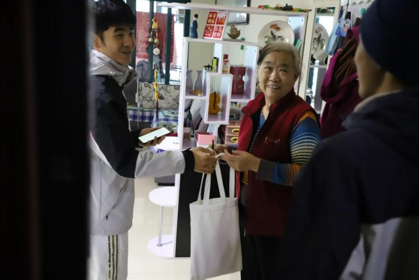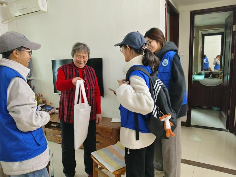活动当天,志愿者们分组入户走访,为社区老人送上精心准备的“暖冬心意盲盒”。每份盲盒内装有暖贴、注水热水袋、柔软羊绒袜等实用物品,承载着学子们对长者的诚挚关怀。这份触手可及的温暖,让老人们在渐冷的季节里感受到浓浓的暖意。