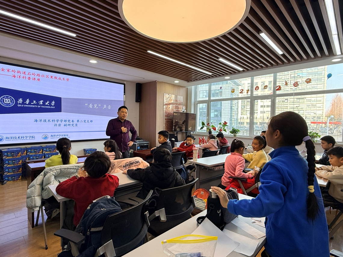 为进一步学习贯彻党的二十届四中全会精神,促进党建活动深入基层社区。近日,齐鲁工业大学(山东省科学院)海洋技术科学学部第二党支部受邀参加石岭路社区“七彩光”儿童训练营共建活动,支部党员许岩做了题为“看见声音”主题海洋科普讲座。崂山区金家岭街道石岭路社区党群服务中心副书记朱新祺及相关工作人员参加活动。